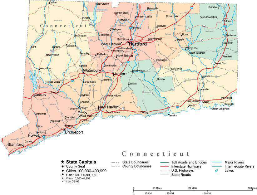 Connecticut US State PowerPower Map, Highways, Waterways, Capital